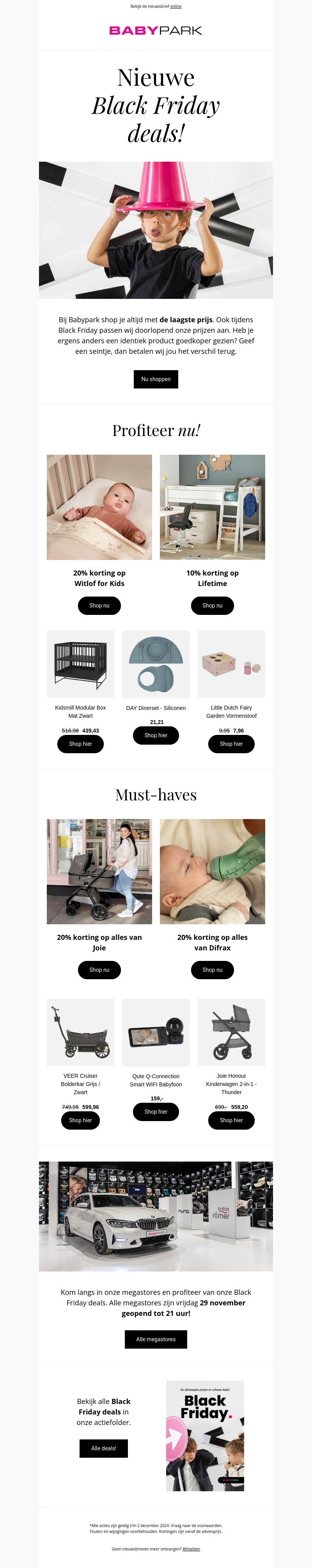 Babypark lanceert gloednieuwe Black Friday deals met kortingen op kinderproducten zoals bedjes, kinderwagens en accessoires. Profiteer van kortingen tot wel 20% op merken als Joie en Difrax. Bezoek onze megastores op 29 november voor extra aanbiedingen. Mis deze kans niet om je favoriete items voordelig te scoren. Bekijk alle aanbiedingen online of in onze folder.