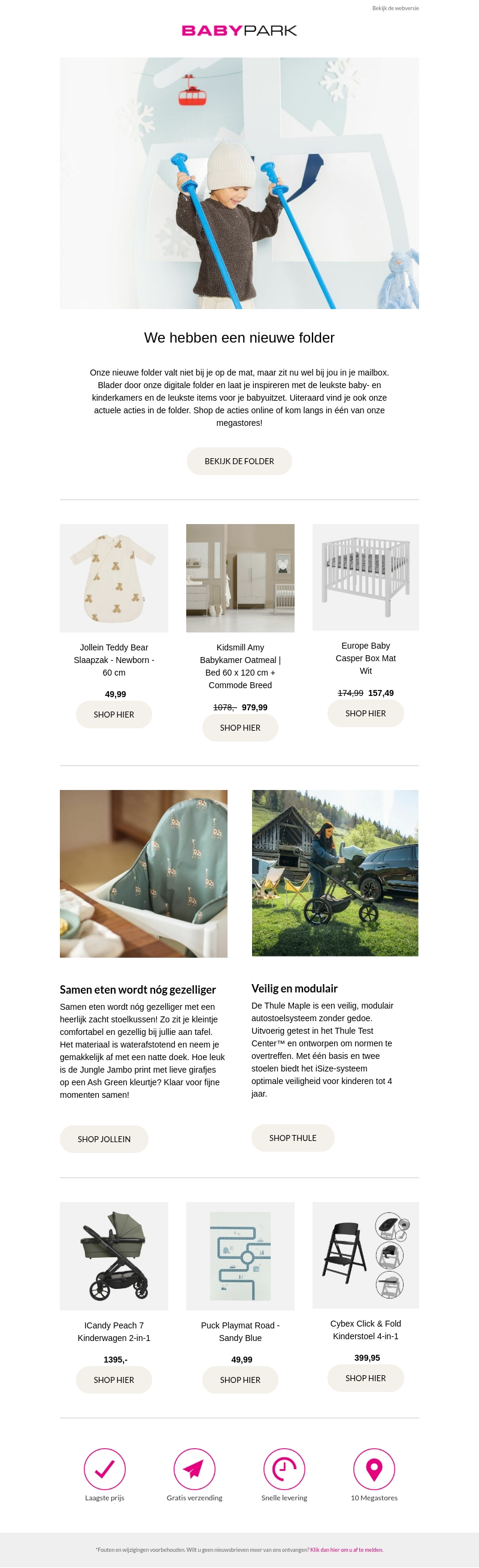 Verwelkom onze nieuwste folder vol met fantastische aanbiedingen voor babykamers en meer. Ontdek de beste deals op kinderbedjes, stoelen en gezellige accessoires. Shop online of bezoek een van onze megastores. Laat je inspireren door onze selectie en breng stijl in je babyuitzet!