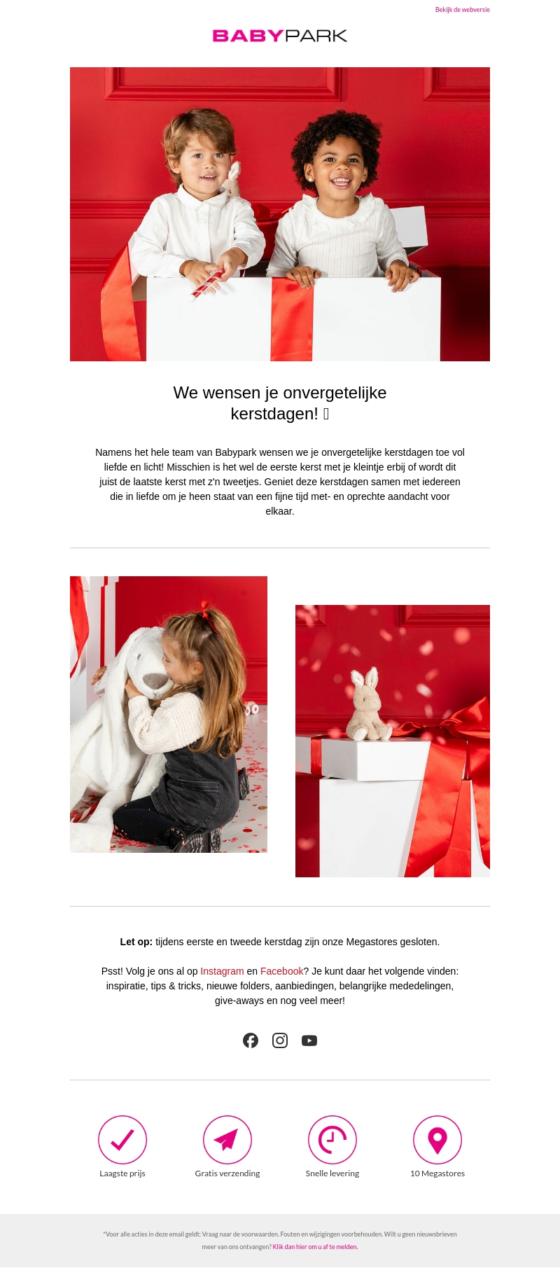 Namens het team van Babypark wensen we je een onvergetelijke kerst toe, vol liefde en licht. Of het nu je eerste kerst met je kindje is, of juist de laatste samen, geniet van deze speciale momenten. Let op: onze Megastores zijn gesloten tijdens de kerstdagen. Blijf verbonden via onze sociale media voor meer inspiratie.