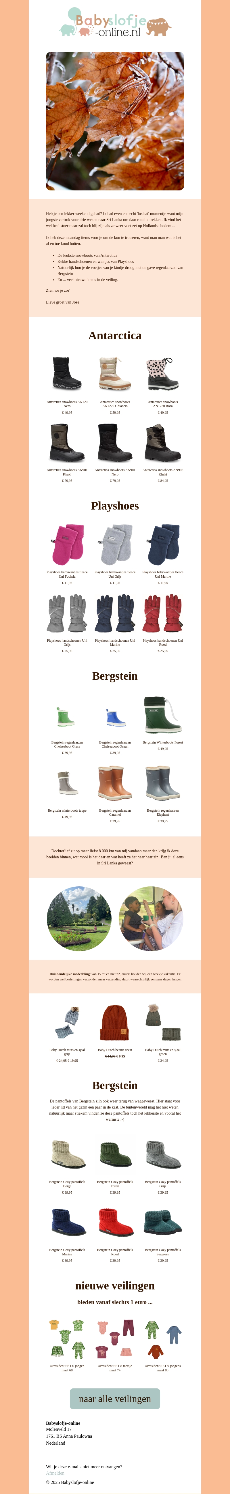 Bereid je voor op de koude maanden met de warme schoenen en accessoires van Babyslofje Online. Of het nu Antarctica sneeuwlaarzen zijn, stijlvolle Playshoes handschoenen, of de kleurrijke Bergstein regenlaarsjes, je vindt alles voor iedere weersomstandigheid. Vergeet niet om te kijken naar de nieuwe veilingen bij Babyslofje Online. Ontdek de collectie nu en kleed je kindje stijlvol en warm aan.