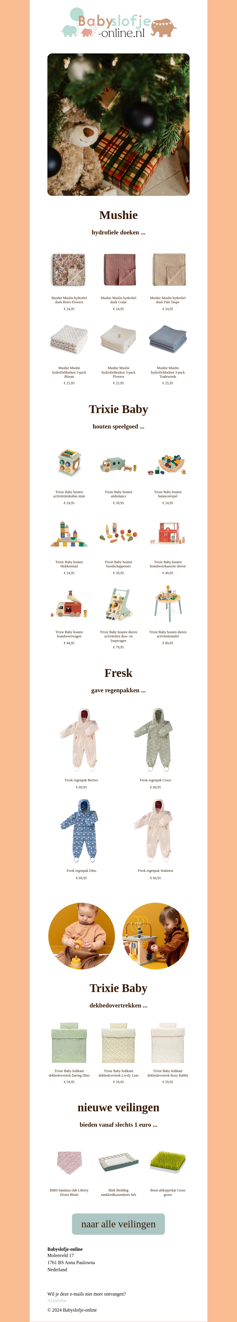 Verken de nieuwste collectie bij Babyslofje-online.nl. Van hydrophiele doeken van Mushie tot leuke houten speelgoed van Trixie Baby, en stijlvolle regenkleding van Fresk. Inclusief nieuwe dekbedovertrekken en unieke veilingitems vanaf slechts 1 euro. Perfecte deals voor de feestdagen!