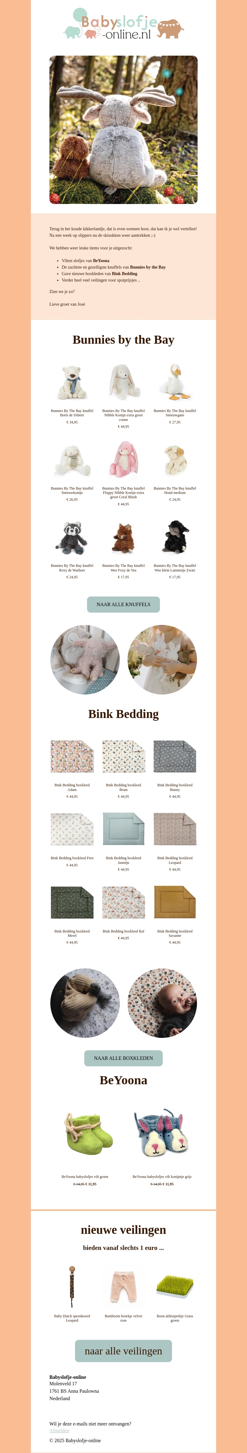 In deze nieuwsbrief ontdek je een schattige selectie van Bunnies by the Bay knuffels en stijlvolle Bink Bedding voor je baby. We bieden ook nieuwe veilingen aan met spannende producten om te ontdekken. Mis de kans niet om jouw favoriete items te bemachtigen voor een geweldige prijs!