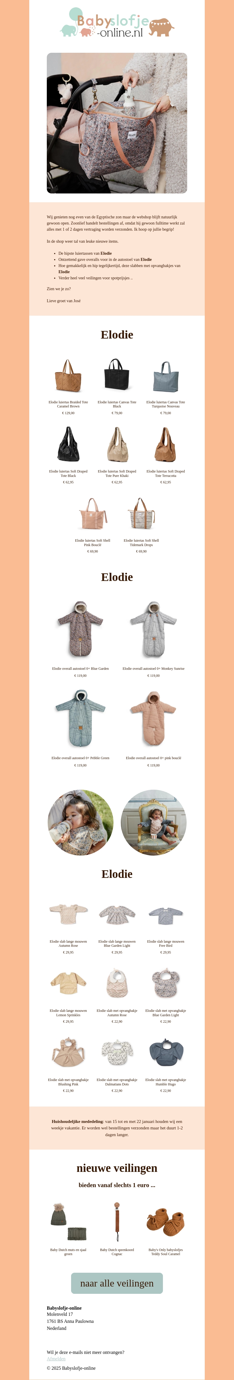 We presenteren trots de nieuwe Elodie collectie, speciaal samengesteld voor jouw stijl en behoeften. Vind een scala aan producten, van stijlvolle tassen tot knusse babykleding. Mis de kans niet om deze unieke items te ontdekken en koop ze direct online!