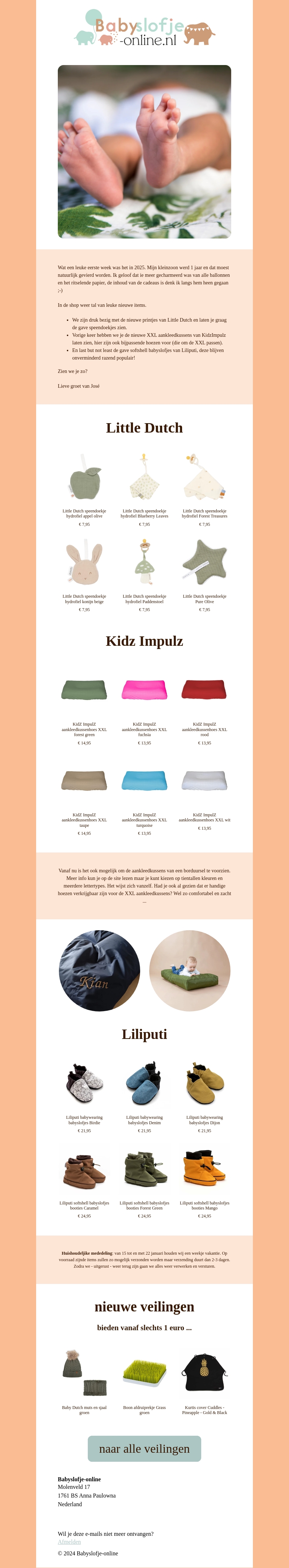 In deze nieuwsbrief presenteren we de nieuwste collectie van Babyslofje-online. Ontdek prachtige producten van bekende merken zoals Little Dutch en Kidz Impulz. Geniet bovendien van exclusieve veilingen waar je al vanaf 1 euro kunt bieden. Bekijk snel de nieuwste items en haal jouw favorieten in huis. Er is voor ieder wat wils, van accessoires tot prachtige slofjes.