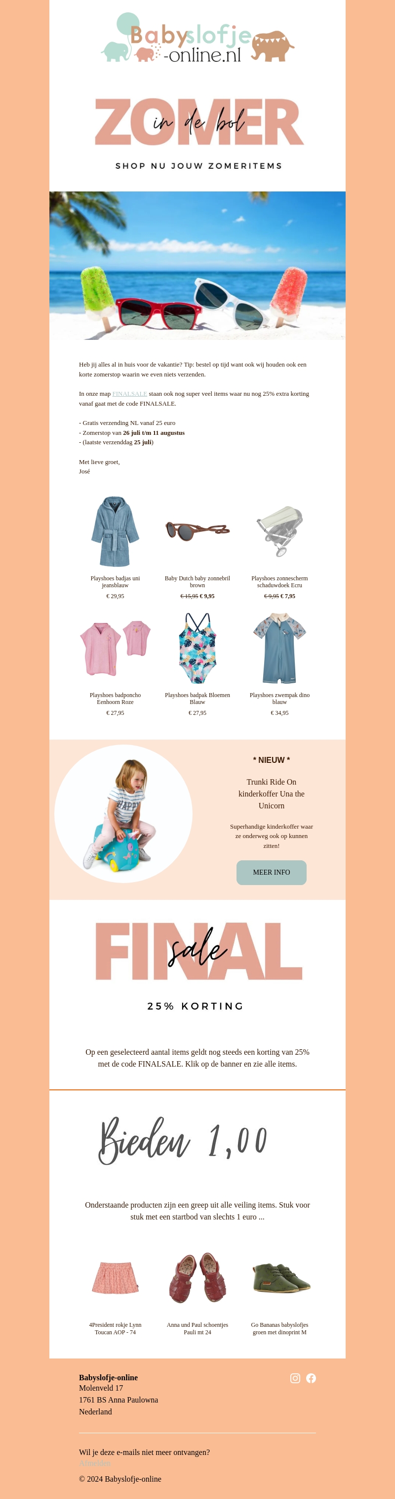 Heb jij alles al in huis voor de vakantie? Bij BabySlofje-Online vind je de leukste zomeritems, van badjassen tot zonnebrillen. Profiteer van 25% korting op geselecteerde items met de code FINALSEA. Bestel op tijd en geniet van gratis verzending vanaf 25 euro. Bekijk ook onze nieuwste kinderproducten zoals de Trunki Ride On kinderkoffer!