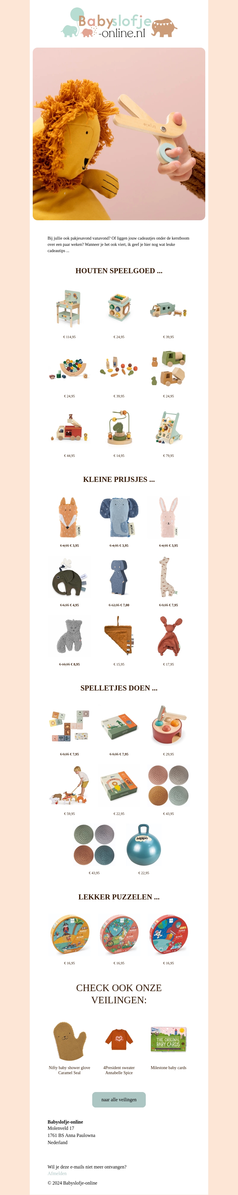 Bij Baby's Lofje Online vind je de leukste cadeautjes voor de komende feestdagen. Ontdek ons assortiment met houten speelgoed, spelletjes en puzzels. Perfect voor Sinterklaas en Kerst. Met unieke aanbiedingen en kleine prijzen zit er voor iedereen wel iets bij. Bekijk ook onze speciale veilingen voor exclusieve items.