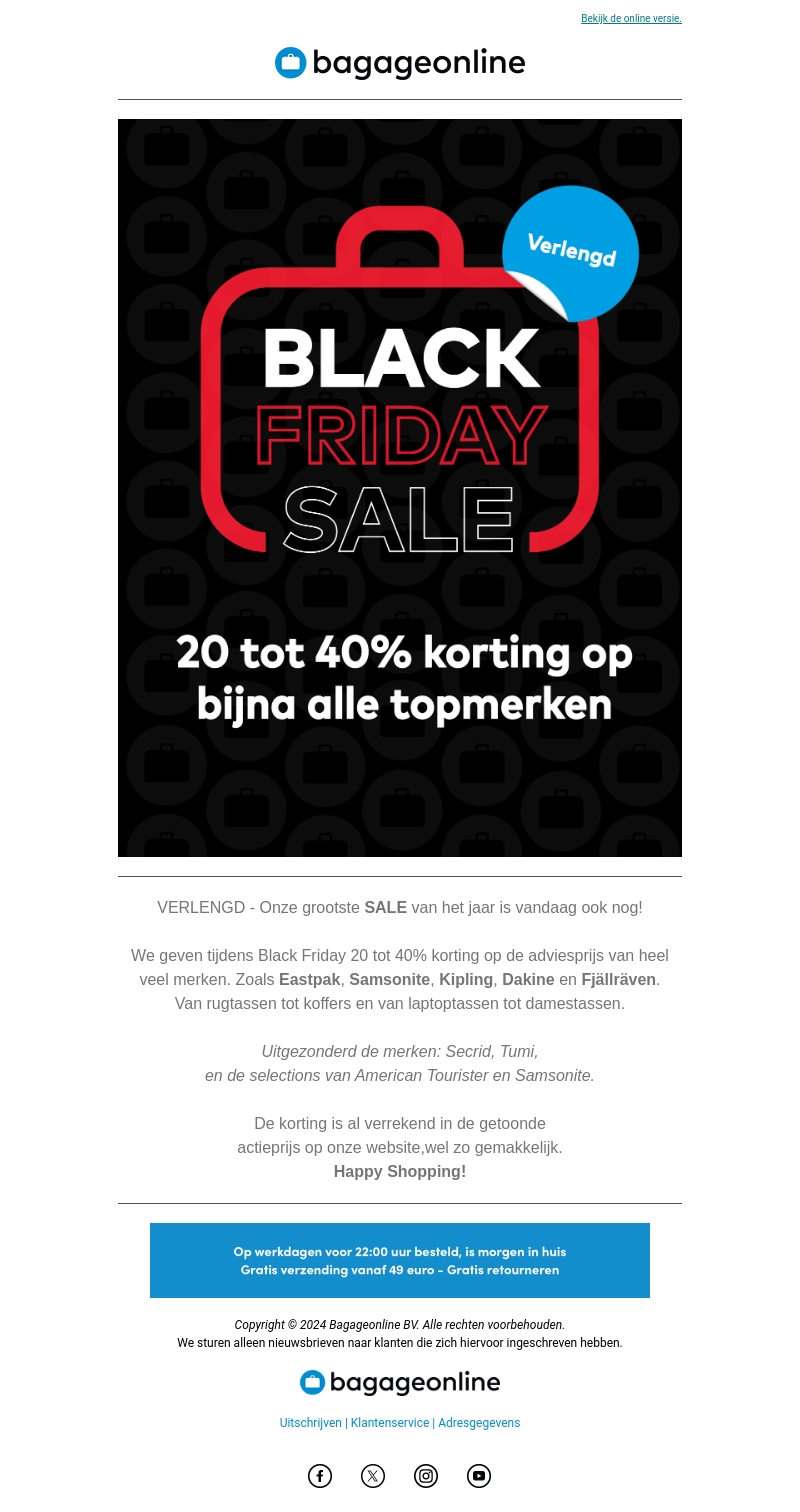 Uitverkoop verlengd! Profiteer nu van 20 tot 40% korting op topmerken zoals Eastpak, Samsonite en meer. Mis deze kans op geweldige deals op tassen en koffers niet. Bekijk de kortingen op onze website voor eenvoudig winkelen en geweldige besparingen.