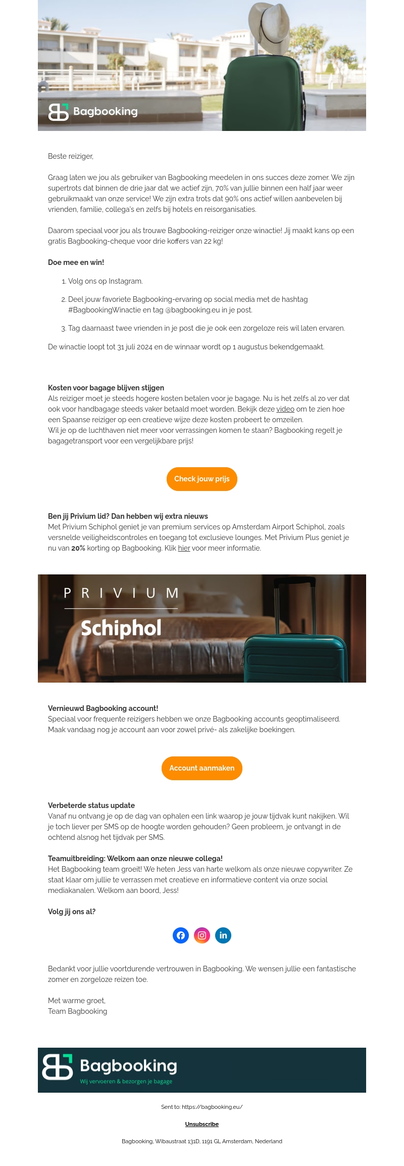 Beste reiziger, ontdek deze zomer de voordelen van Bagbooking. Vier ons succes met een kans op een gratis cheque voor koffertransport. Bespaar kosten op bagage en profiteer van exclusieve Privium-voordelen op Schiphol. Lees verder voor meer informatie en onze speciale aanbiedingen.