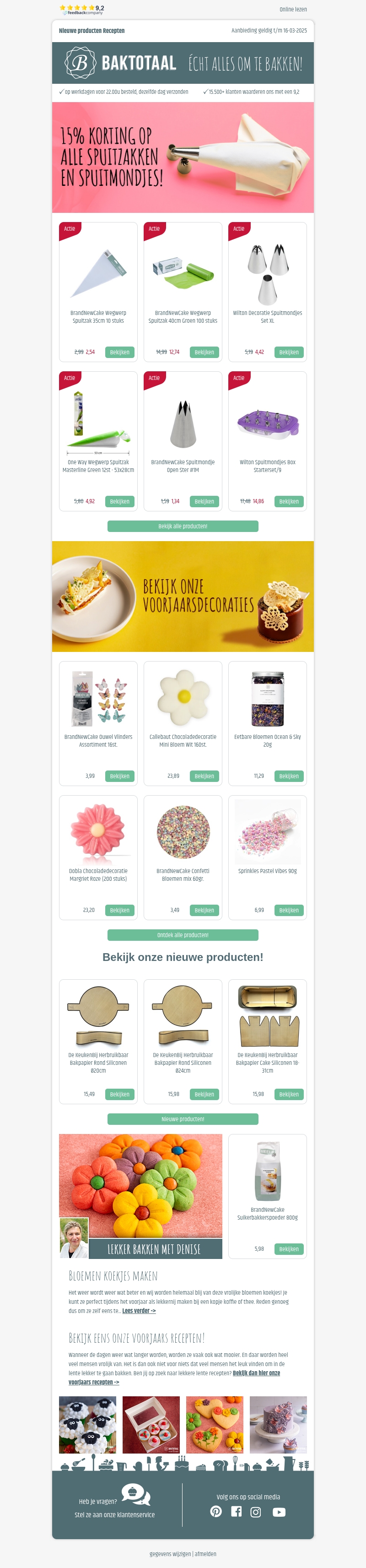 Ontvang 15% korting op spuitzakken en spuitmondjes bij Baktotaal. Deze aanbieding is perfect voor bakkers die hun vaardigheden willen verbeteren. Bestel voor 22:00 uur en geniet van levering de volgende dag. Bekijk ook onze nieuwe voorjaarsdecoraties en andere producten voor in de keuken. Haal alles in huis om te bakken met Baktotaal!