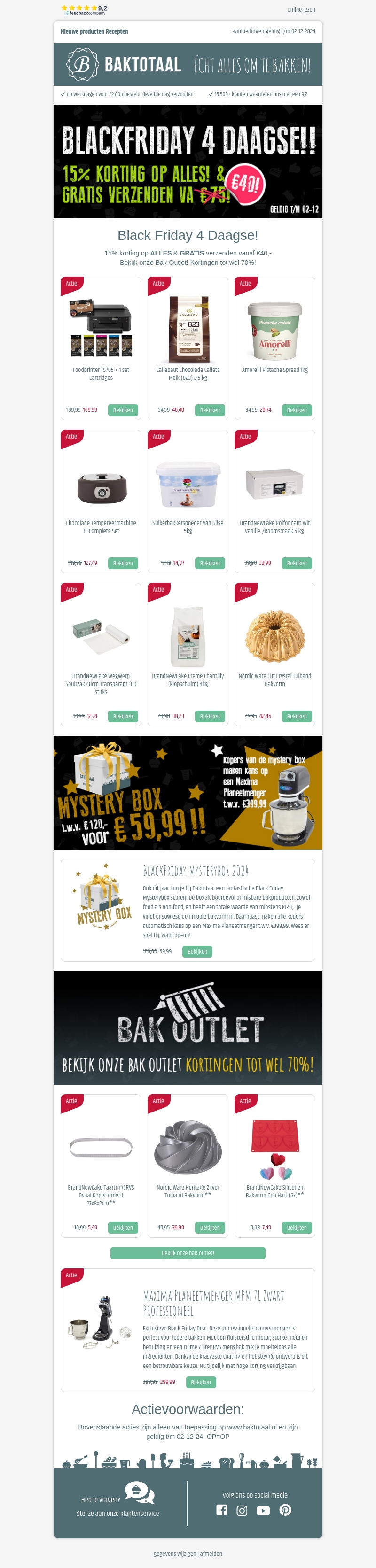 Bij BakTotaal is het Black Friday feest met 15% korting op alles. Ontvang bovendien gratis verzending bij bestellingen vanaf €40. Bekijk onze geweldige aanbiedingen, inclusief onze Mystery Box voor slechts €59,99. Bezoek onze Bak-Outlet voor kortingen tot wel 70%.