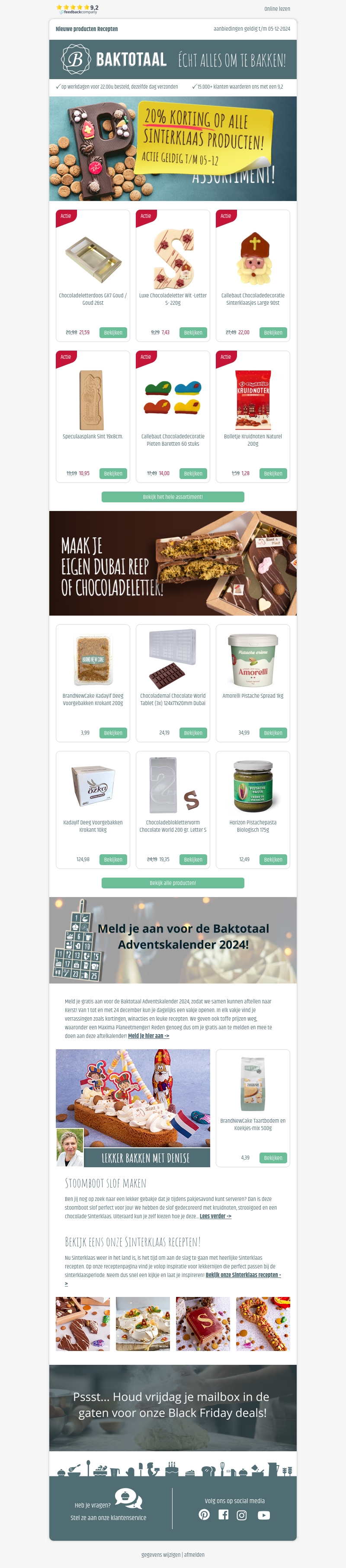 Profiteer van 20% korting op een breed assortiment aan Sinterklaasproducten bij Baktotal. Van speculaasvormen tot chocoladelollies, bereid je voor op het heerlijk avondje. Deze speciale actie is geldig tot en met 5 december, dus wees er snel bij. In de nieuwsbrief vind je ook tips voor het maken van een eigen chocoladereep. Meld je aan voor de adventskalender 2024 en ontdek meer heerlijke recepten.