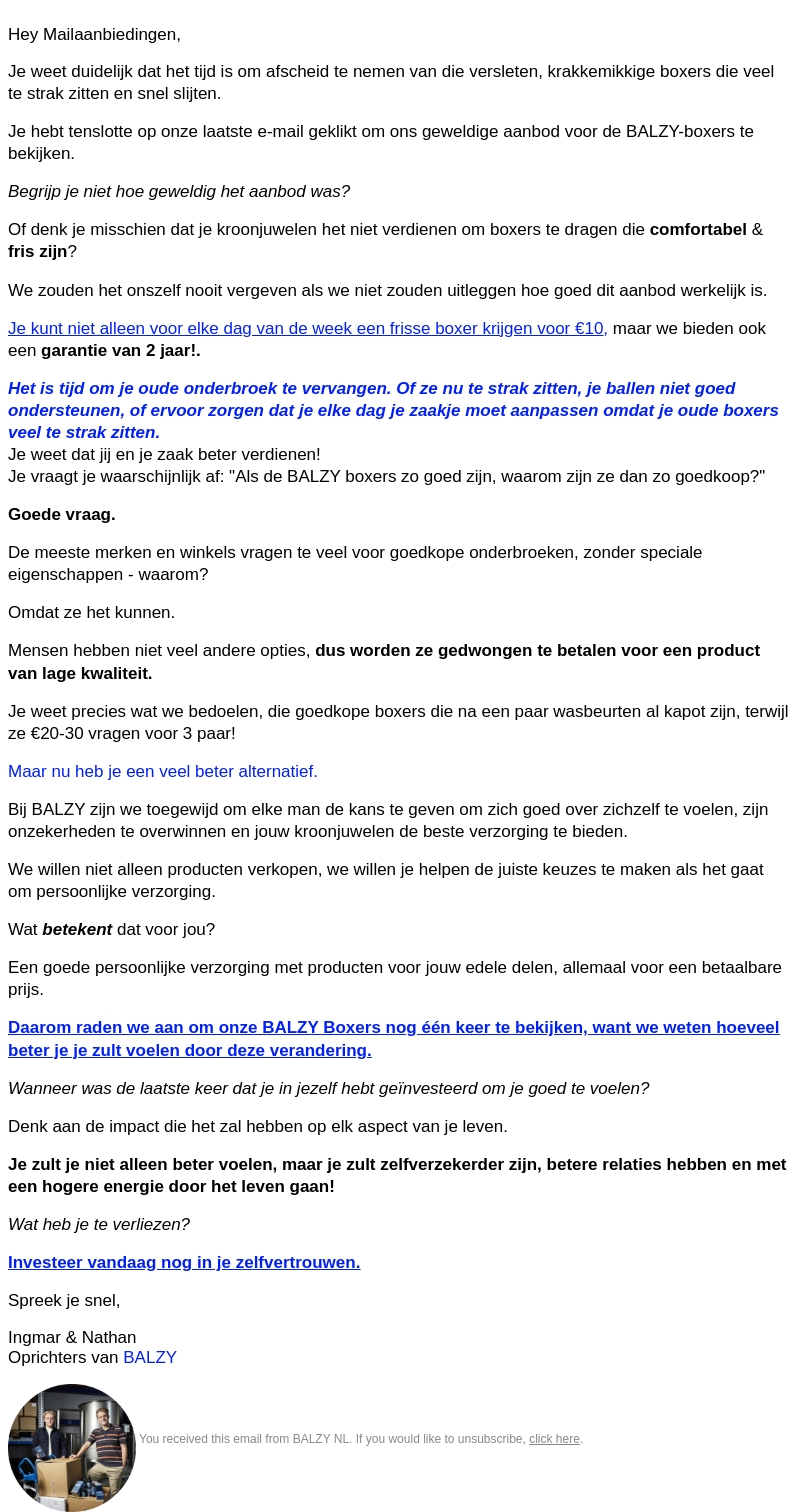 Het is tijd om jouw versleten ondergoed te vervangen door comfortabele en frisse BALZY-boxers! Niet alleen krijg je elke dag een frisse boxer voor slechts โฌ10, maar we bieden ook een garantie van 2 jaar. Investeer vandaag nog in je zelfvertrouwen en ervaar het verschil.