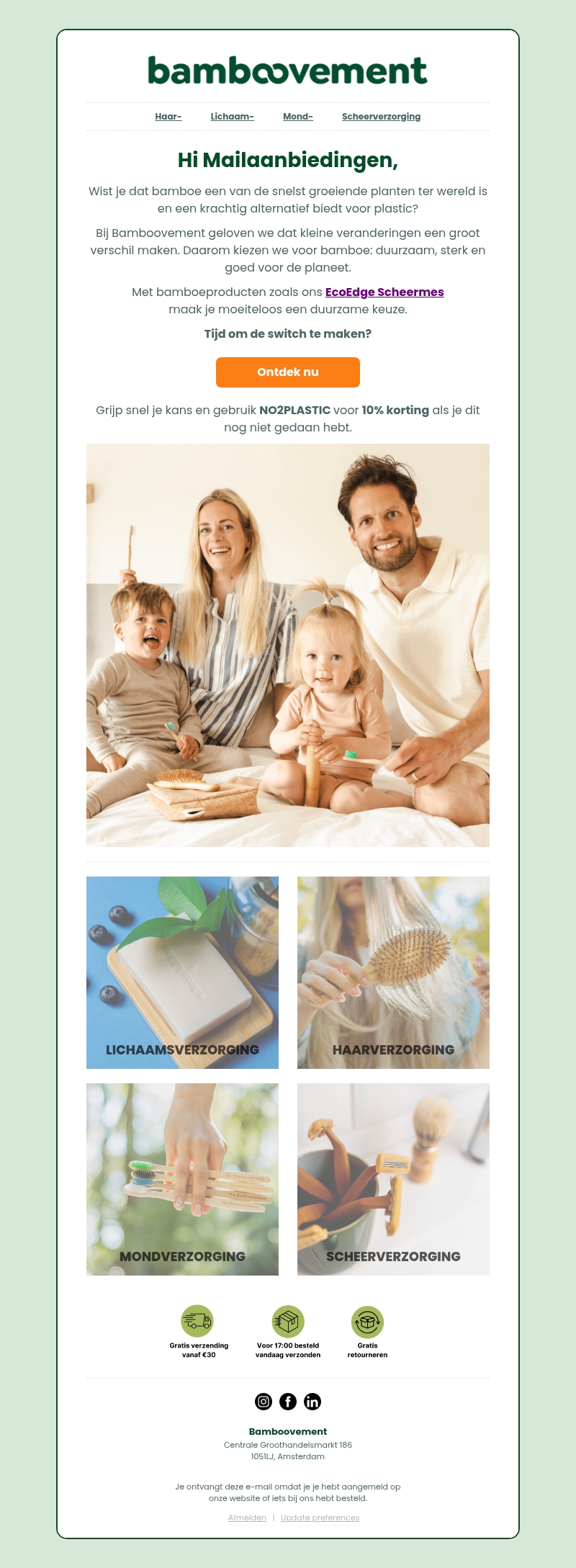 Bamboe is een van de snelst groeiende planten en biedt een krachtig alternatief voor plastic. Bij Bamboovement geloven we in de kracht van kleine veranderingen. Kies voor duurzaam met onze EcoEdge Scheermes en andere bamboeproducten. Profiteer nu van 10% korting met de code NO2PLASTIC.