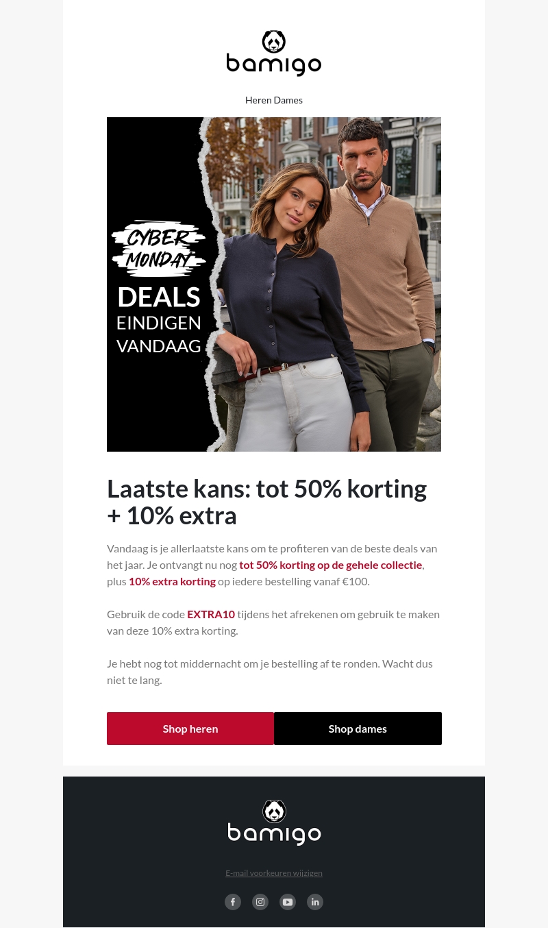 Mis deze laatste kans niet om te profiteren van de geweldige Cyber Monday deals bij Bamigo. Ontvang tot 50% korting op de gehele collectie en krijg 10% extra korting op alle bestellingen vanaf €100. Alleen vandaag geldig, gebruik de code EXTRA10 voor extra korting.
