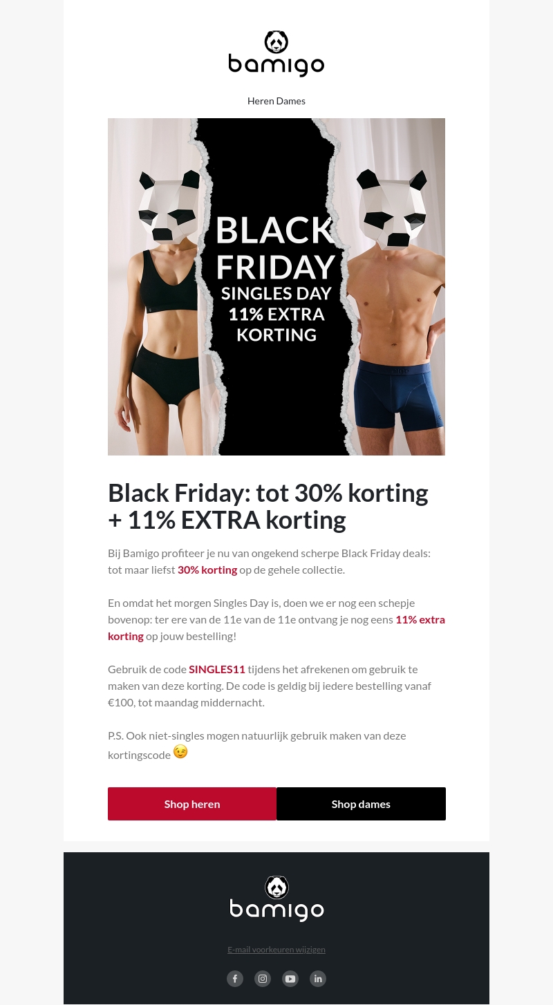 Bij Bamigo ontvang je nu spectaculaire Black Friday aanbieidingen met kortingen tot 30% op de volledige collectie. Speciaal voor Singles Day krijg je een extra 11% korting bij gebruik van de code SINGLES11. Profiteer van deze exclusieve aanbiedingen die slechts kort beschikbaar zijn. Iedereen kan deze kortingscode gebruiken, niet enkel voor singles. Bestel en bespaar nu, geldig voor aankopen vanaf €100 tot en met maandag middernacht.