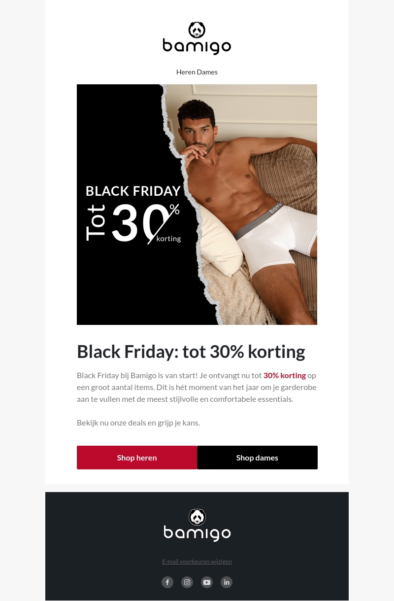 Black Friday is begonnen bij Bamigo! Ontvang tot 30% korting op een grote selectie items. Dit is dé kans om jouw garderobe te vernieuwen met stijlvolle en comfortabele kleding. Bezoek nu onze website en profiteer van deze geweldige aanbiedingen. Mis het niet!