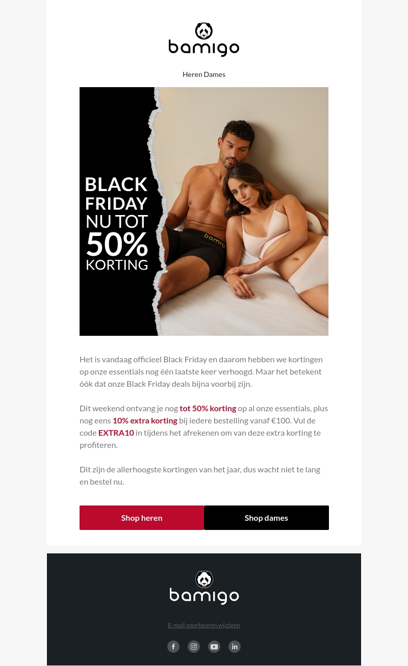 Ontdek de exclusieve Black Friday kortingen bij Bamigo. Geniet van kortingen tot wel 50% op essentials en ontvang 10% extra korting bij bestellingen vanaf €100 met code EXTRA10. Mis deze kans niet op de hoogste kortingen van het jaar!