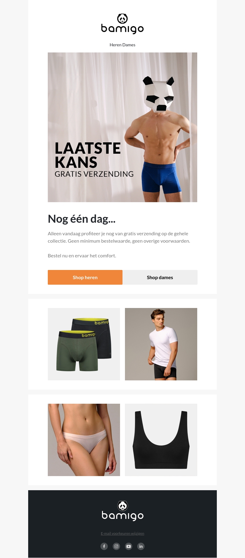 Mis deze laatste kans niet! Bamigo biedt alleen vandaag gratis verzending op de gehele collectie. Er zijn geen minimale bestelwaarde en geen andere voorwaarden. Bestel nu en ervaar het comfort van onze producten. Shop nu voor heren en dames.