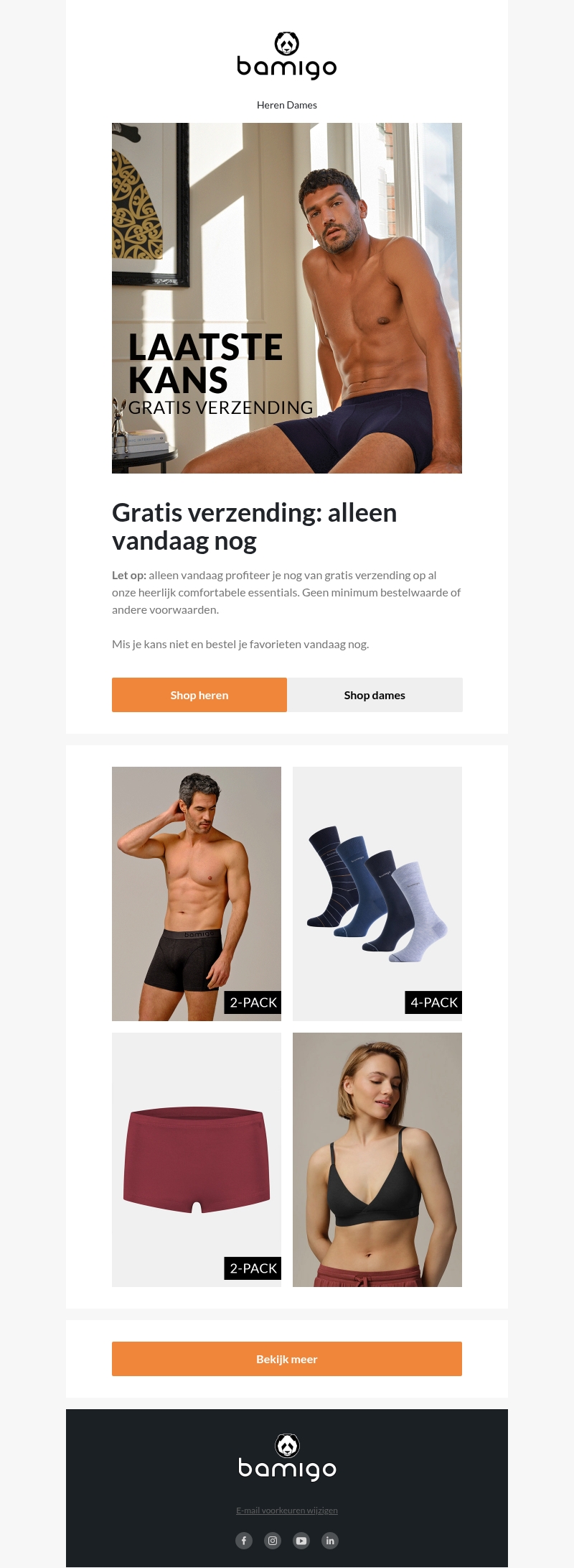 Profiteer vandaag van gratis verzending op alle Bamigo producten. Deze unieke kans geldt alleen vandaag, zonder minimale bestelwaarde. Ontdek onze comfortabele essentials nu en bestel je favorieten. Mis deze kans niet en shop vandaag nog. Bekijk ons volledige assortiment voor heren en dames.