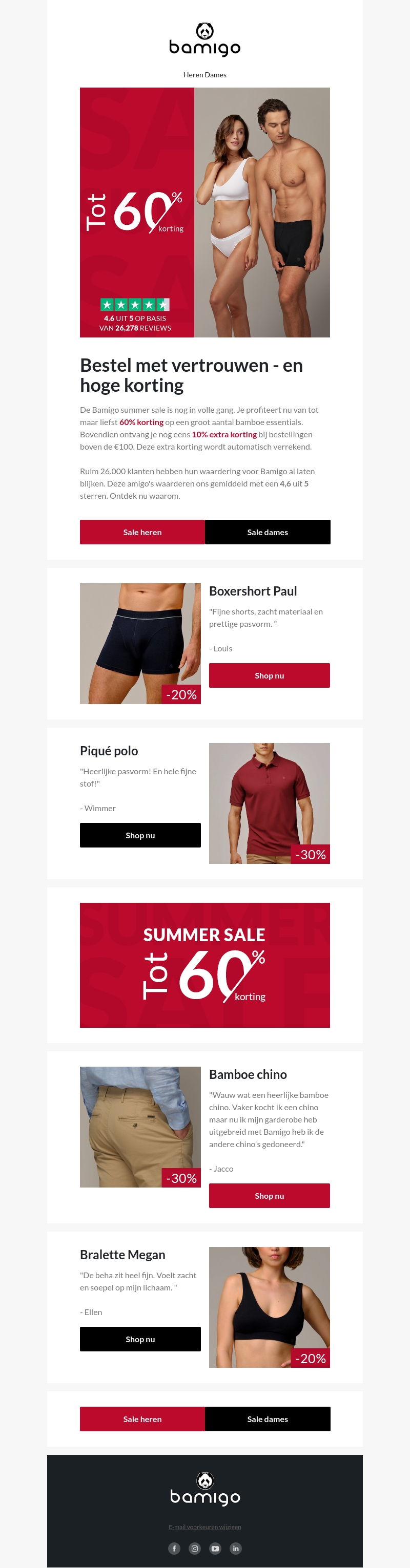 De Bamigo summer sale biedt kortingen tot 60% op diverse bamboe essentials. Ontvang extra 10% korting bij bestellingen boven de €100. Meer dan 26.000 tevreden klanten hebben Bamigo beoordeeld met 4,6 sterren uit 5. Profiteer nu van deze geweldige aanbiedingen.