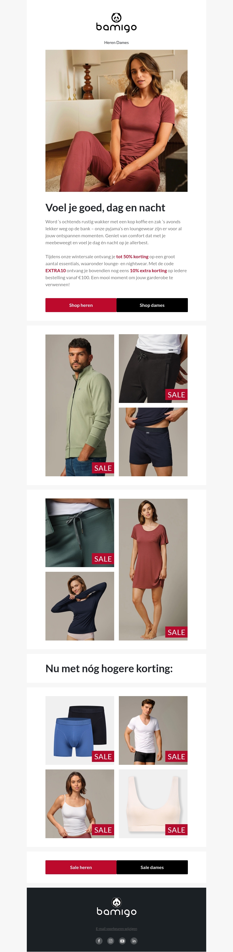Voel je goed, dag en nacht, met de nieuwste collectie van Bamigo. Profiteer van de winteruitverkoop met kortingen tot 50% op essentials zoals pyjama's en loungewear. Gebruik de code EXTRA10 voor 10% extra korting op elke bestelling vanaf €100. Tijd om je garderobe te vernieuwen!