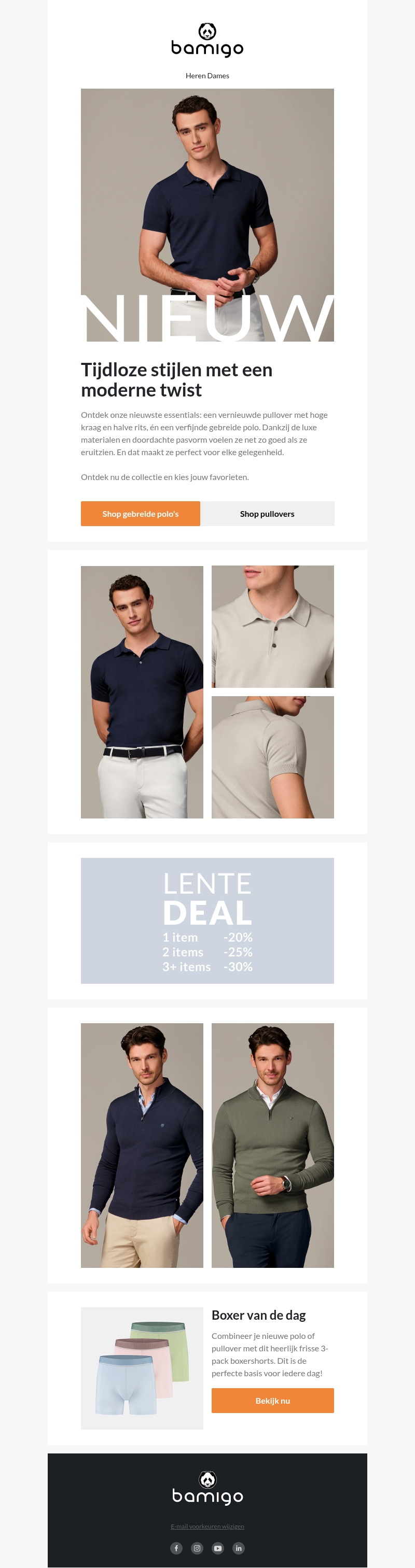 Ontdek Bamigo's nieuwste collectie met stijlvolle gebreide polo's en pullovers. Deze essentials combineren luxe materialen met een perfecte pasvorm, ideaal voor elke gelegenheid. Profiteer nu van onze Lente Deal met kortingen tot 30%! Combineer je stijl met onze veelzijdige boxershorts voor een complete look.