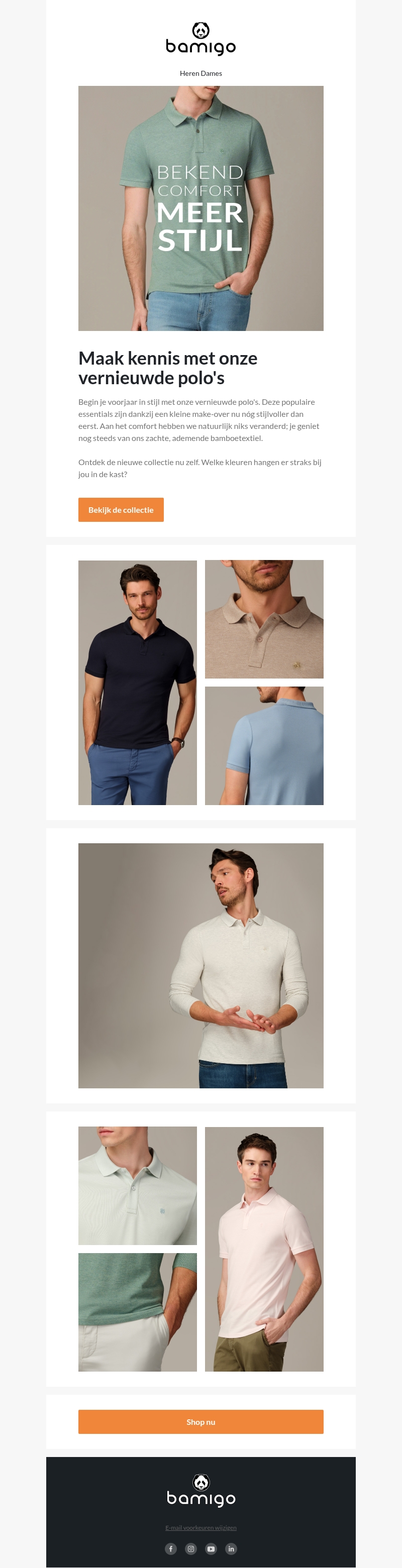 Begin je voorjaar in stijl met de vernieuwde polo's van Bamigo. Deze essentials hebben een kleine make-over gekregen, waardoor ze nog stijlvoller zijn. Het comfort blijft ongewijzigd dankzij het zachte, ademende bamboetextiel. Verken de nieuwe collectie en ontdek welke kleuren bij jou passen. Geniet van een frisse start van het seizoen met Bamigo's modieuze polo's.