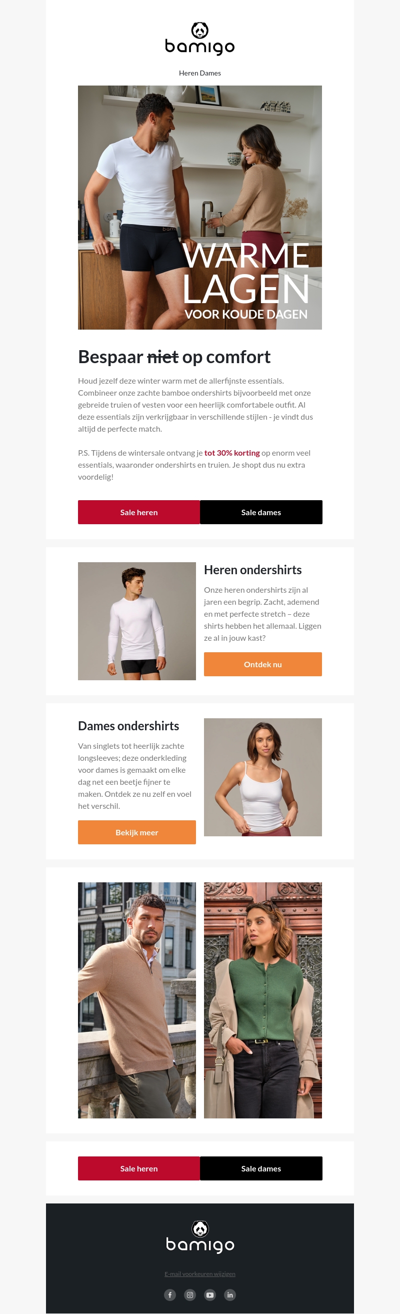 Houd jezelf warm deze winter met onze bamboe ondershirts en gebreide truien. Ontvang tot 30% korting op essentials voor heren en dames. Kies de perfecte lagen die stijl en comfort combineren.