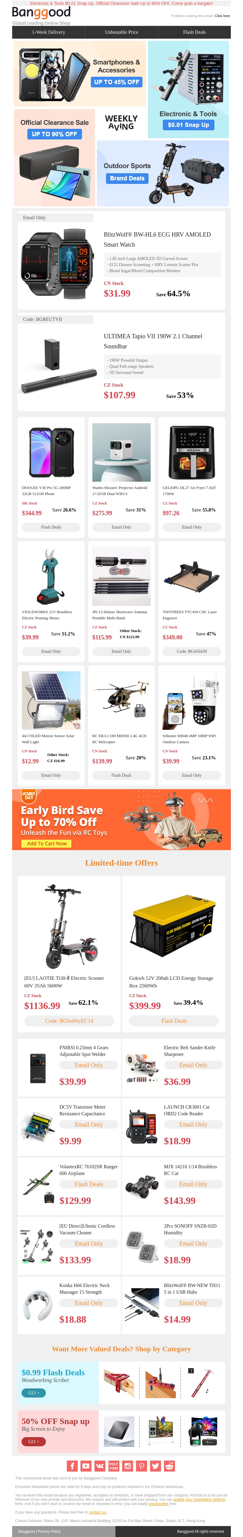 Ontdek de exclusieve Early Bird aanbiedingen met spectaculaire kortingen. Koop nu de ECG HRV AMOLED Smart Watch voor maar $31.99 en bespaar 64.5%. Ook de Air Fryer met 12 presets is nu beschikbaar met een korting van 55%. Wacht niet te lang, deze deals zijn maar tijdelijk beschikbaar. Grijp je kans nu!