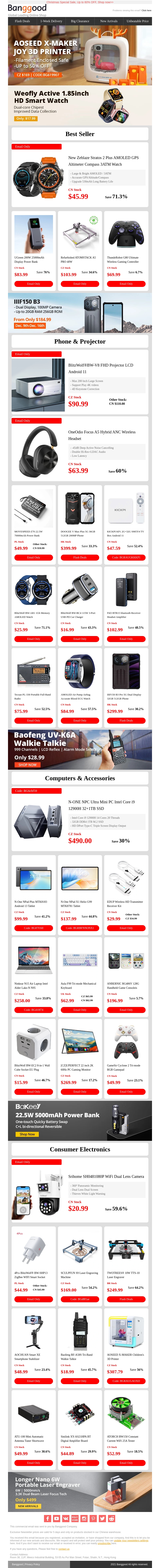 Deze nieuwsbrief biedt ongelooflijke aanbiedingen op populaire gadgets zoals de Zeblaze Stratos 2 Plus horloge voor slechts $45.99 en de AOSEED X-MAKER JOY 3D Printer voor $169. Ontdek ook andere geweldige deals op smartwatches, smartphones, en draagbare apparaten. Deze limited-time aanbiedingen van Banggood zorgen ervoor dat je niets mist van de nieuwste technologie tegen de beste prijzen. Profiteer nu van deze kans en vernieuw je gadgetscollectie. De voorraad is beperkt, dus wacht niet te lang!