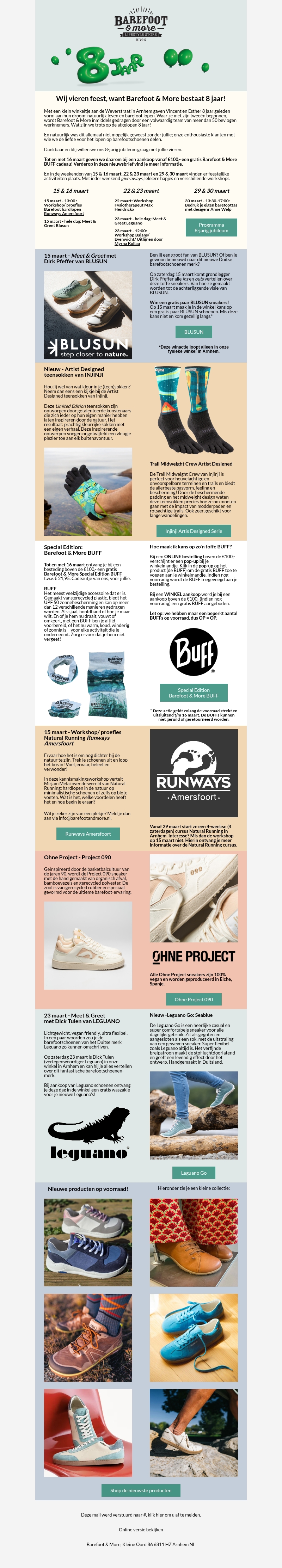 Barefoot & More viert feest ter ere van hun 8-jarig bestaan. Ontdek diverse workshops, meet & greets en speciale aanbiedingen. Doe mee aan activiteiten in Amsterdam, Amersfoort en Havelte gedurende de hele maand maart. Mis deze unieke evenementen en exclusieve producten niet, waaronder een speciale editie van BUFF. Geniet van sportieve uitdagingen, inclusief de Nationale Running Runways.