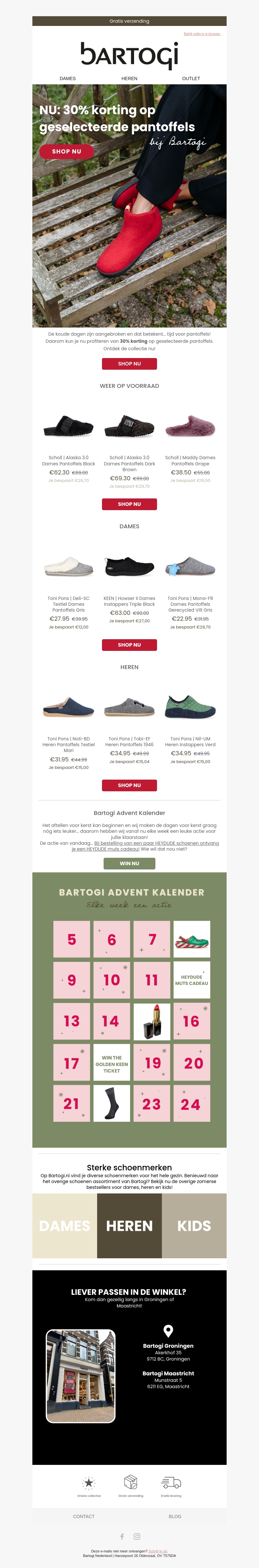 Profiteer nu van een exclusieve 30% korting op geselecteerde pantoffels van topmerken bij Bartogi. Kies uit een ruim assortiment van stijlvolle en comfortabele pantoffels voor zowel dames als heren. De aanbieding is tijdelijk, dus mis het niet! Ga naar onze website om de volledige collectie te bekijken en plaats uw bestelling. Gratis verzending bij elke aankoop, alleen vandaag geldig.