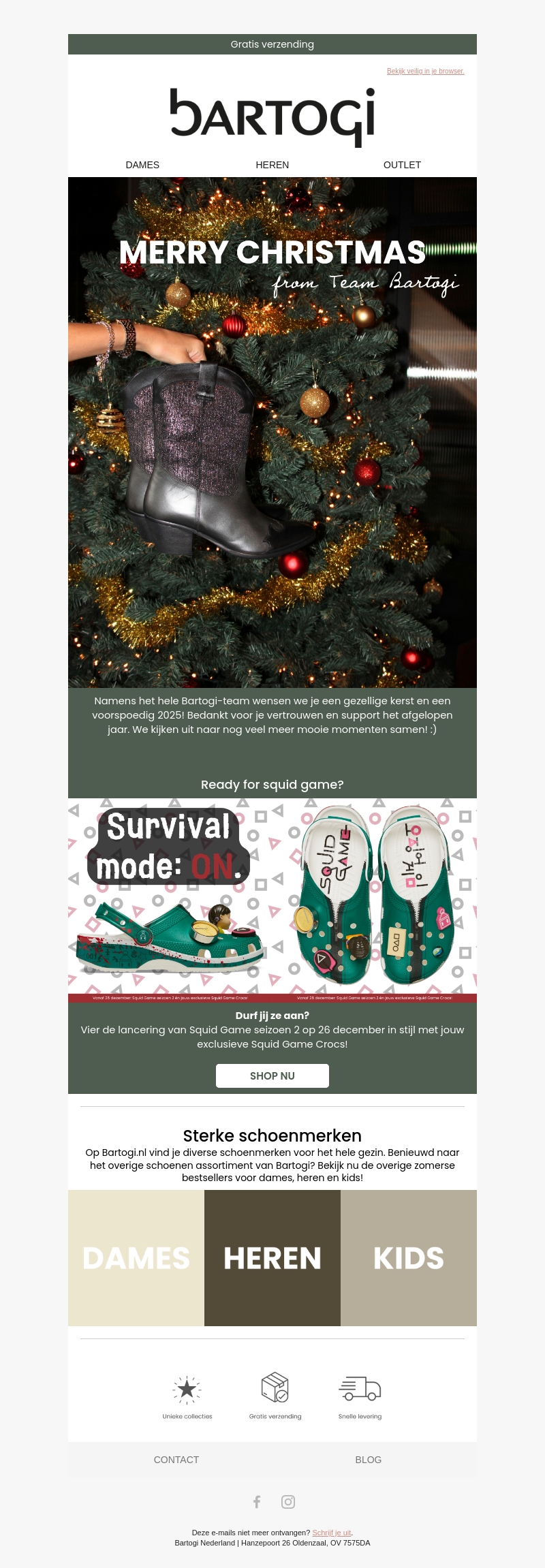 Het Bartogi-team wenst je fijne feestdagen en een voorspoedig 2025! Verwen jezelf met stijlvolle schoenen en ontdek onze nieuwste items. Mis de exclusieve Squid Game Crocs niet, perfect voor de feestdagen. Met gratis verzending en unieke collecties maken we jouw shoppingervaring nog beter. Blijf op de hoogte van de laatste trends voor dames, heren en kids. Shop nu en geniet van de beste deals!