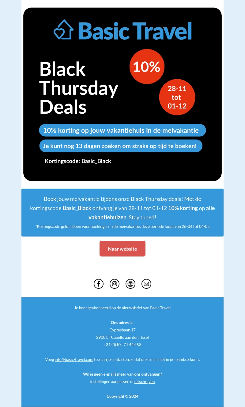 Vier de aankomende vakantie met de Black Thursday Deals van Basic Travel. Geniet van 10% korting op je vakantiehuis tijdens de meivakantie met de kortingscode Basic_Black. Deze aanbieding is geldig van 28 november tot 1 december. Mis deze kans niet om je perfecte vakantiehuis met korting te boeken. Blijf op de hoogte en boek snel!