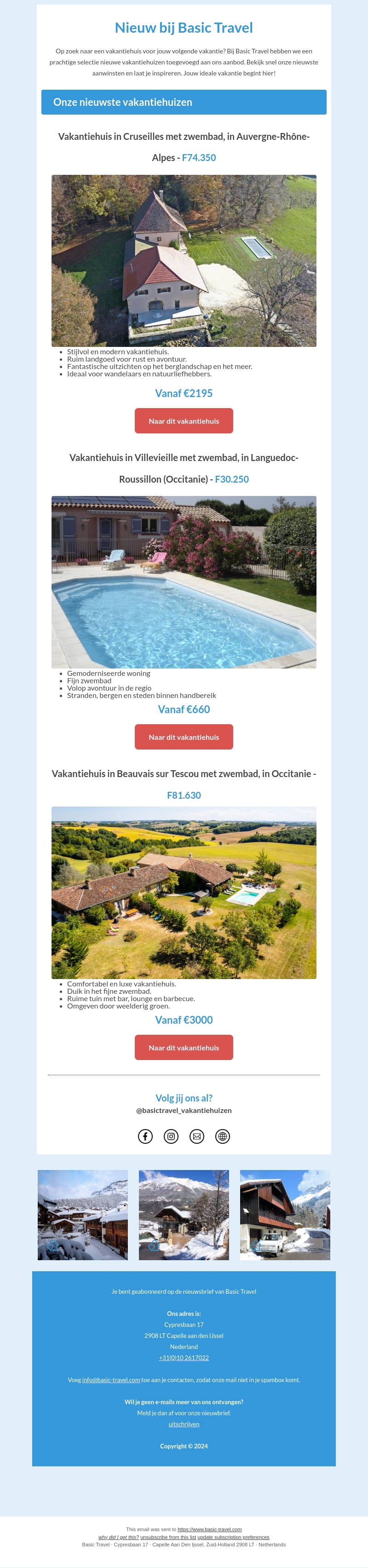 Ontdek de nieuwste vakantiehuizen bij Basic Travel, perfect gelegen in prachtige regio's zoals Auvergne-Rhรดne-Alpes en Occitaniรซ. Laat je inspireren door stijlvolle en moderne verblijven, compleet met zwembad. Deze vakantiehuizen zijn ideaal voor een ontspannen en avontuurlijke vakantie. Geniet van comfort, ruimte en adembenemende uitzichten in een groene omgeving. Begin je volgende vakantie met Basic Travel.
