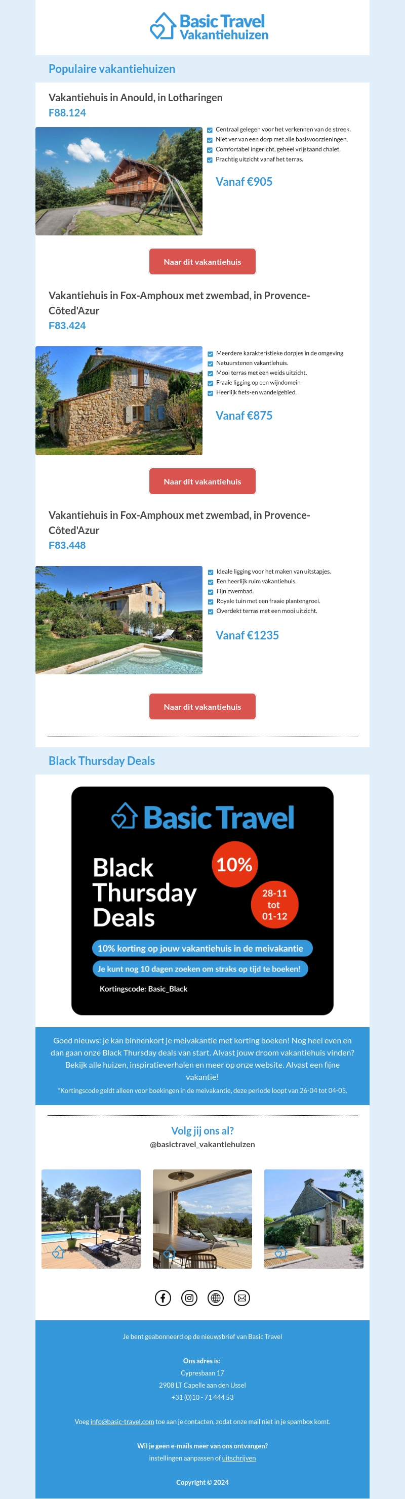 Verken de mooiste vakantiehuizen in Frankrijk met Basic Travel. Geniet van onze Black Thursday deals met 10% korting op geselecteerde verblijven. Bekijk populaire opties zoals het vakantiehuis in Anould of die met zwembad in Provence-Côte d'Azur. Boek je droomvakantiehuis nu en profiteer van prachtige uitzichten en comfortabele accommodaties.