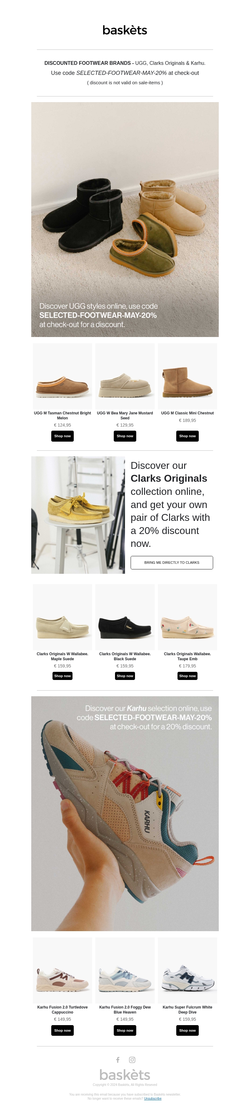 20% off – selected footwear brands: UGG, Clarks Originals & Karhu