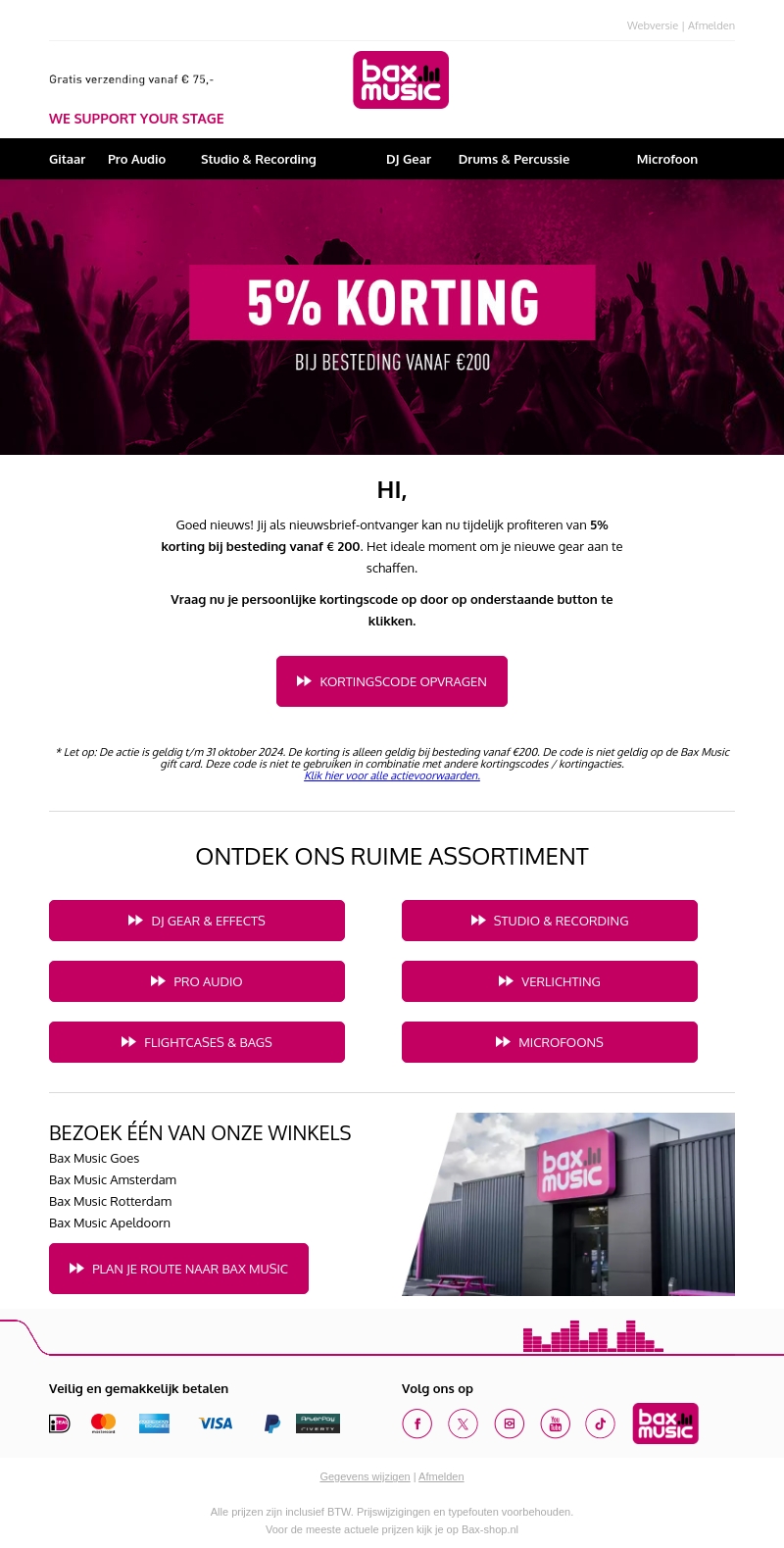 Goed nieuws voor muziekliefhebbers! Ontvang tijdelijk 5% korting bij Bax Music bij een minimale besteding van €200. Perfect voor het aanschaffen van nieuwe gear. Vraag nu je persoonlijke kortingscode aan via onderstaande knop.