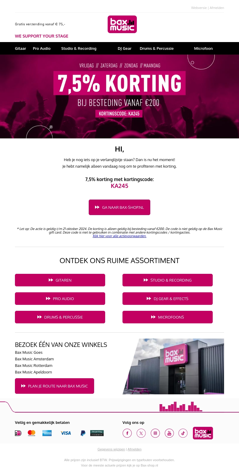 Bax Music biedt je vandaag 7,5% korting op aankopen vanaf €200. Gebruik de kortingscode KA245 om van deze aanbieding te profiteren. Mis deze kans niet om je favoriete muzikale apparatuur aan te schaffen.