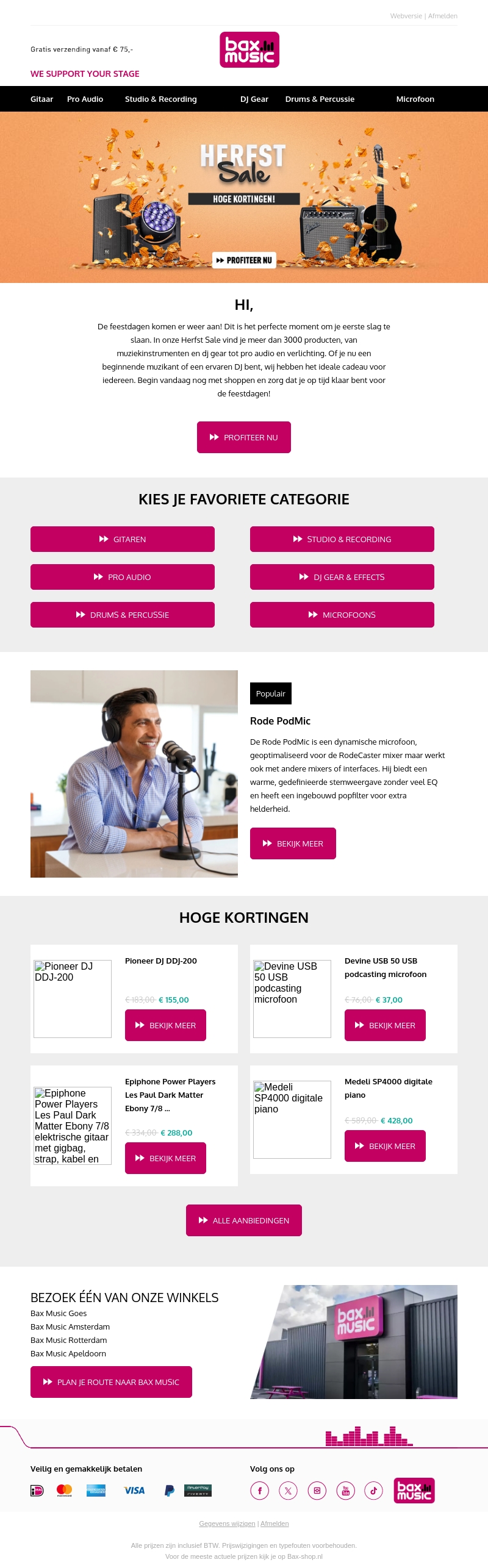 De feesten komen eraan, en dat betekent geweldige deals bij Bax Music. Met meer dan 3000 producten in de Herfst Sale, vind je alles van muziekinstrumenten tot pro audio en verlichting. Ontdek nu de perfecte cadeaus voor muzikanten en DJ's. Geniet van hoge kortingen en maak je klaar voor het feestseizoen. Bezoek onze winkels in Amsterdam, Rotterdam, Goes of Apeldoorn voor nog meer aanbiedingen!
