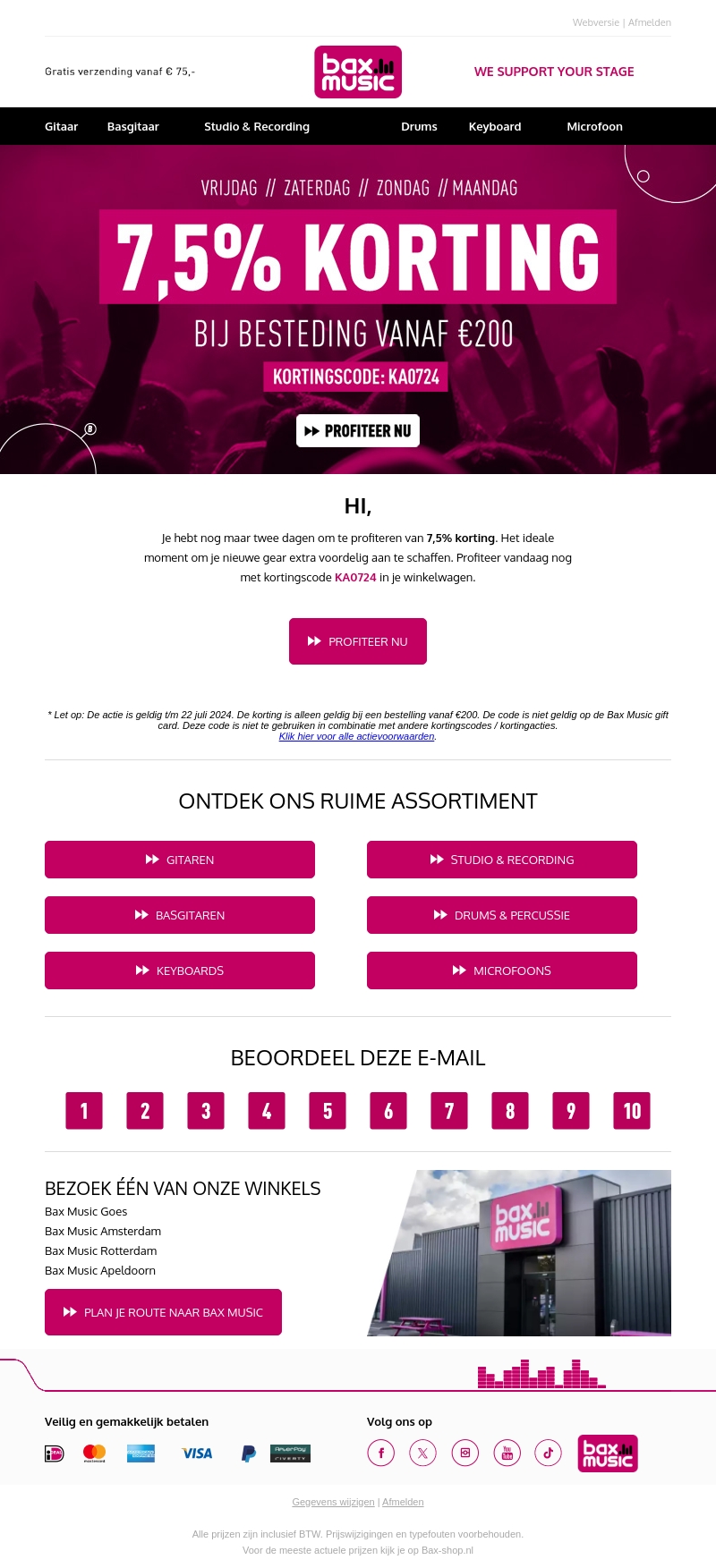 Je hebt nog maar twee dagen om te profiteren van 7,5% korting bij Bax Music. Gebruik kortingscode KA0724 bij besteding vanaf €200 om te besparen op je nieuwe gear. Mis deze kans niet en shop nu!