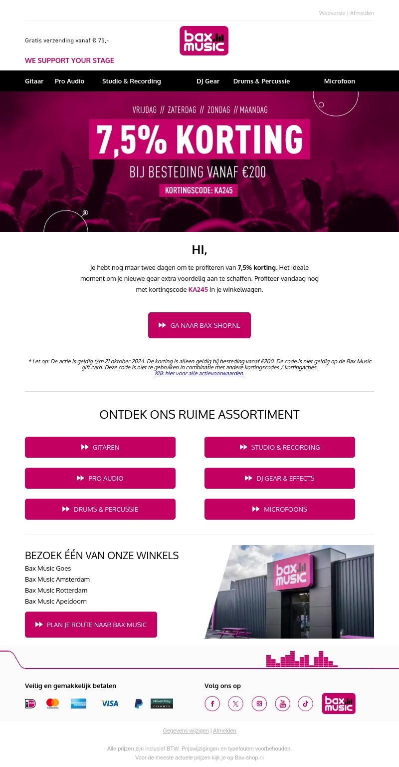 Je hebt nog maar twee dagen om te profiteren van 7,5% korting bij Bax Music op bestellingen vanaf €200. Gebruik de kortingscode KA245 en ontdek het ruime assortiment aan muziekinstrumenten en apparatuur. Wees snel en maak je aankoop voordelig!