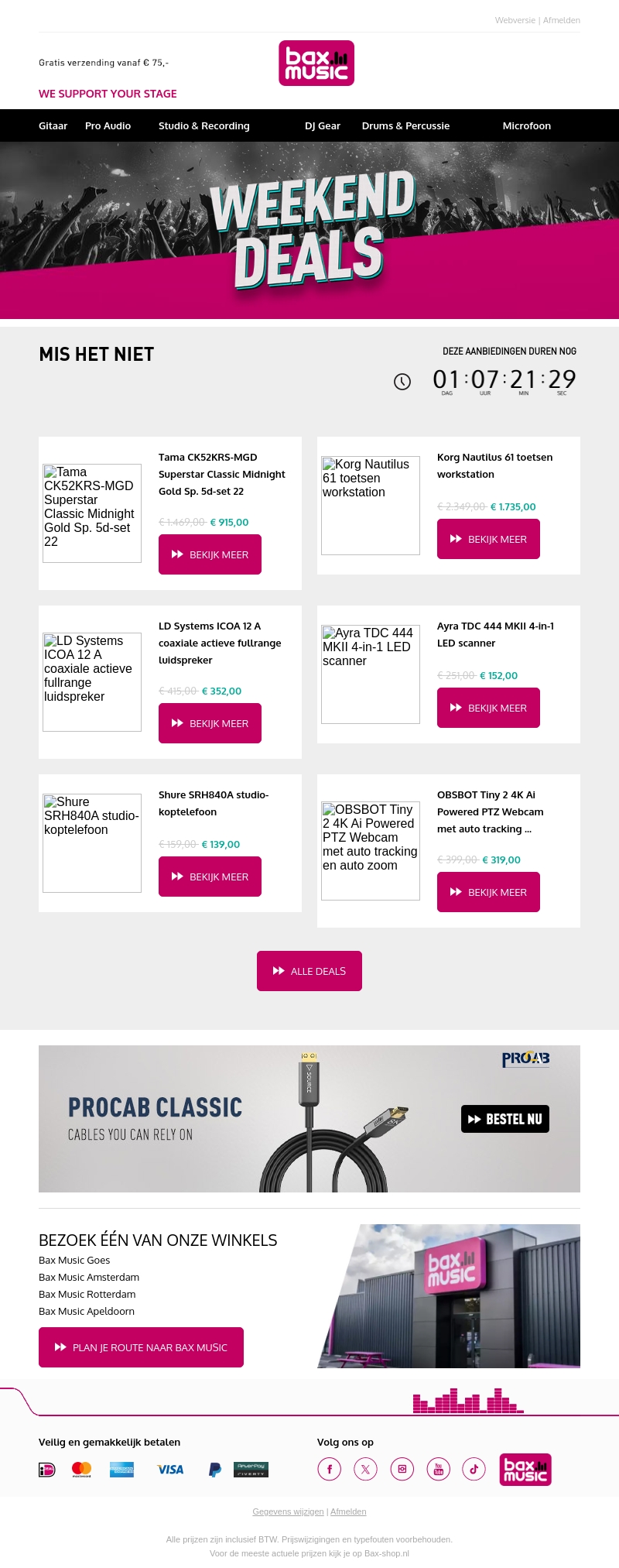 Ontdek de nieuwste weekenddeals bij Bax Music, uw ultieme bestemming voor muziekinstrumenten en professionele audioapparatuur. Profiteer van geweldige kortingen op merken zoals Tama, Korg en Shure. Deze aanbiedingen zijn slechts tijdelijk beschikbaar, dus zorg ervoor dat je ze niet mist. Bezoek één van onze winkels in Amsterdam, Rotterdam of Apeldoorn. Geniet van gratis verzending vanaf € 75. Wacht niet te lang, want de aanbiedingen eindigen snel!