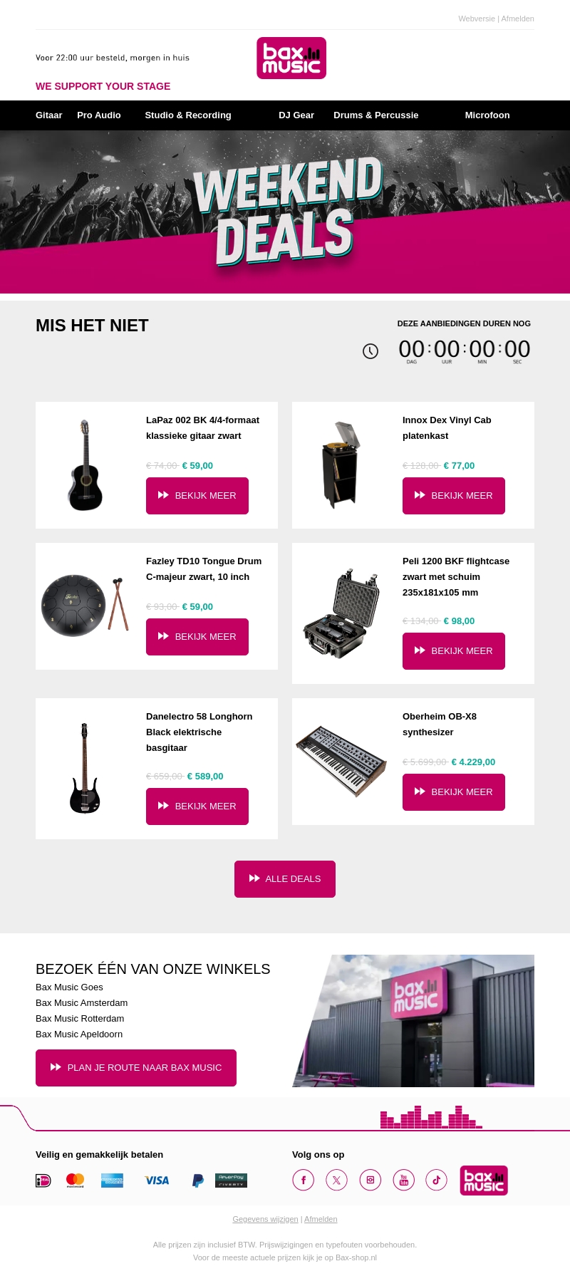 Ontdek de spectaculaire weekenddeals bij Bax Music! Van gitaren tot synthesizers, er is iets voor elke muziekliefhebber. Dankzij de kortingen zijn deze topproducten nog aantrekkelijker. Bezoek ook onze winkels voor meer aanbiedingen en persoonlijke hulp. Zorg dat je deze deals niet mist!