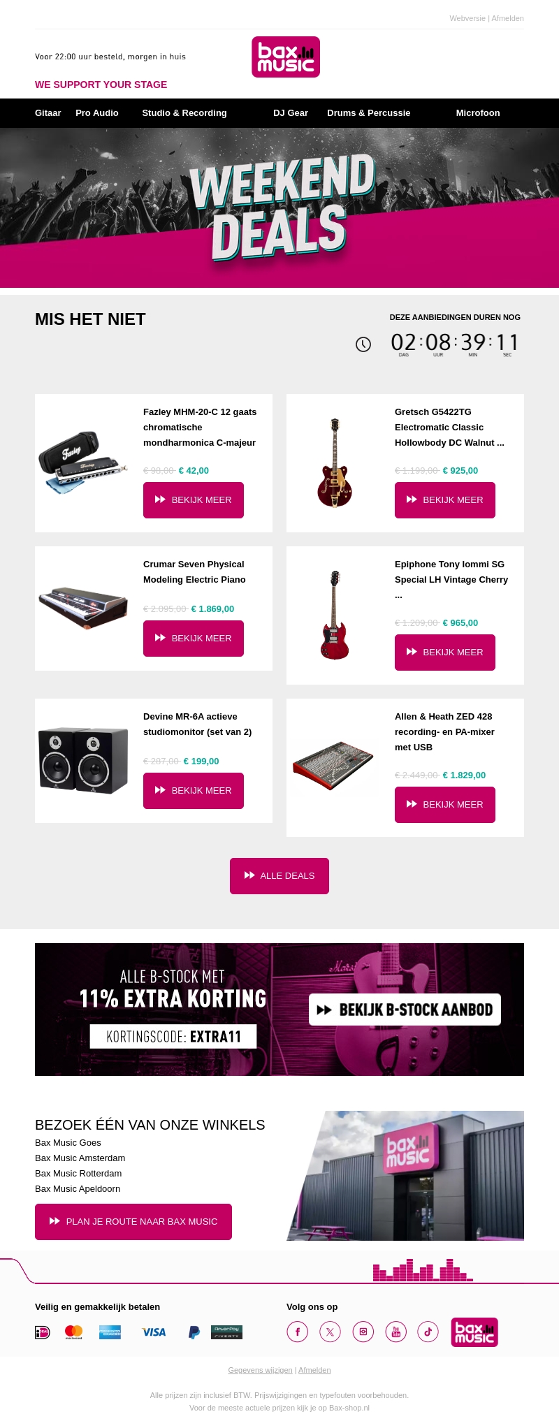 Mis de geweldige weekenddeals van Bax Music niet, met fantastische kortingen op muziekinstrumenten zoals gitaren, pianos en studioapparatuur. Profiteer van 11% extra korting op alle B-stock items met de kortingscode EXTRA11. Bezoek een van onze winkels in Amsterdam, Rotterdam, Apeldoorn of Goes voor meer aanbod. Alle prijzen zijn inclusief BTW.