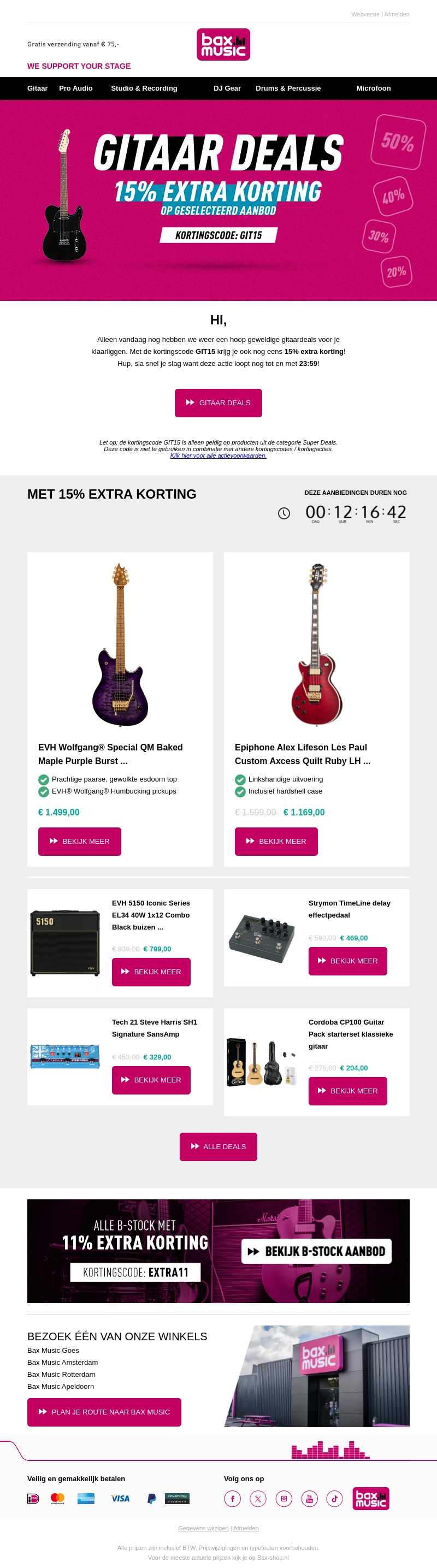 Profiteer van onze laatste gitaar deals met 15% extra korting. Gebruik de kortingscode GIT15 en shop nu je favoriete gitaar. De aanbieding geldt voor een beperkte tijd, dus wees snel. Ontdek ook de B-stock met 11% extra korting. Bezoek onze winkels voor de nieuwste deals.