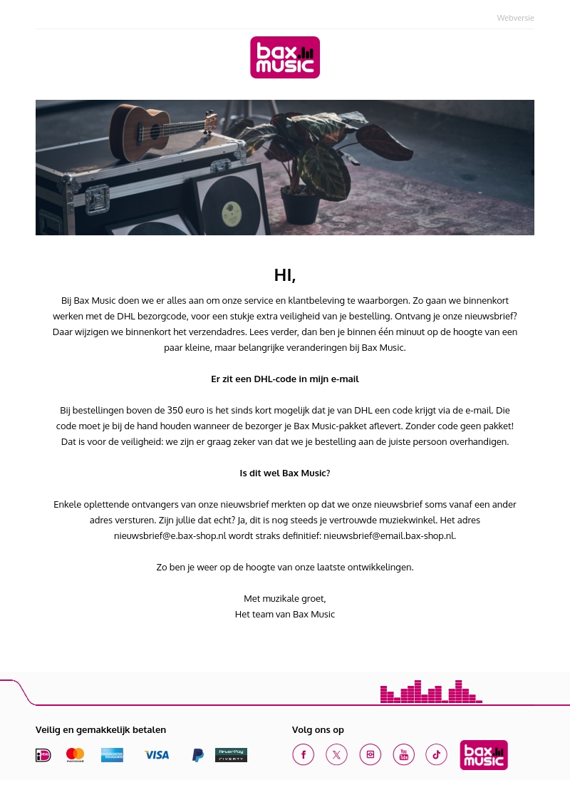 Bij Bax Music zorgen we continu voor verbeteringen in onze service en klantbeleving. Ontvang je onze nieuwsbrief? We introduceren nu een DHL-code voor extra veiligheid. Dit is belangrijk bij bestellingen boven de 350 euro. Bovendien is ons e-mailadres veranderd om misverstanden te voorkomen. Blijf op de hoogte van onze laatste ontwikkelingen met Bax Music.