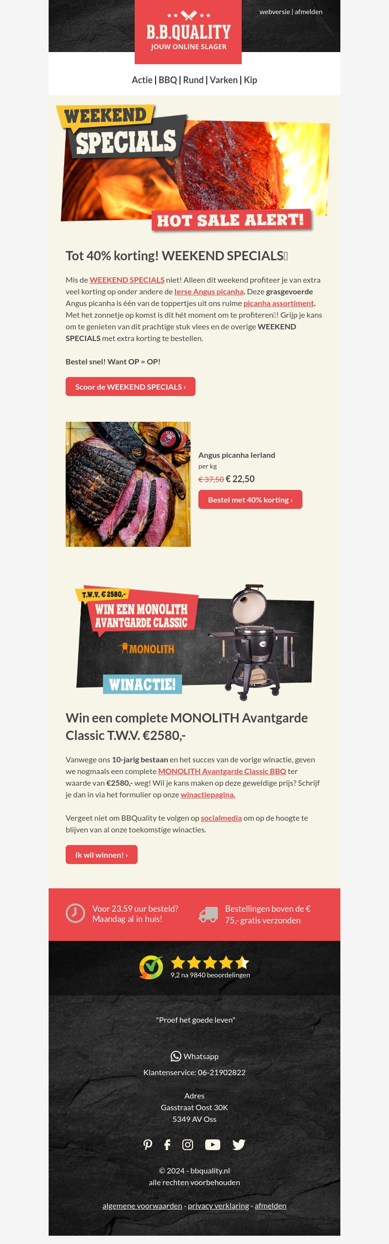 Ontdek nu de WEEKEND SPECIALS van B.B.Quality met tot wel 40% korting op Ierse Angus picanha. Grijp deze kans om te genieten van dit geweldige stuk vlees. Bestel snel, want OP = OP. Meer weten? Lees verder voor alle informatie!