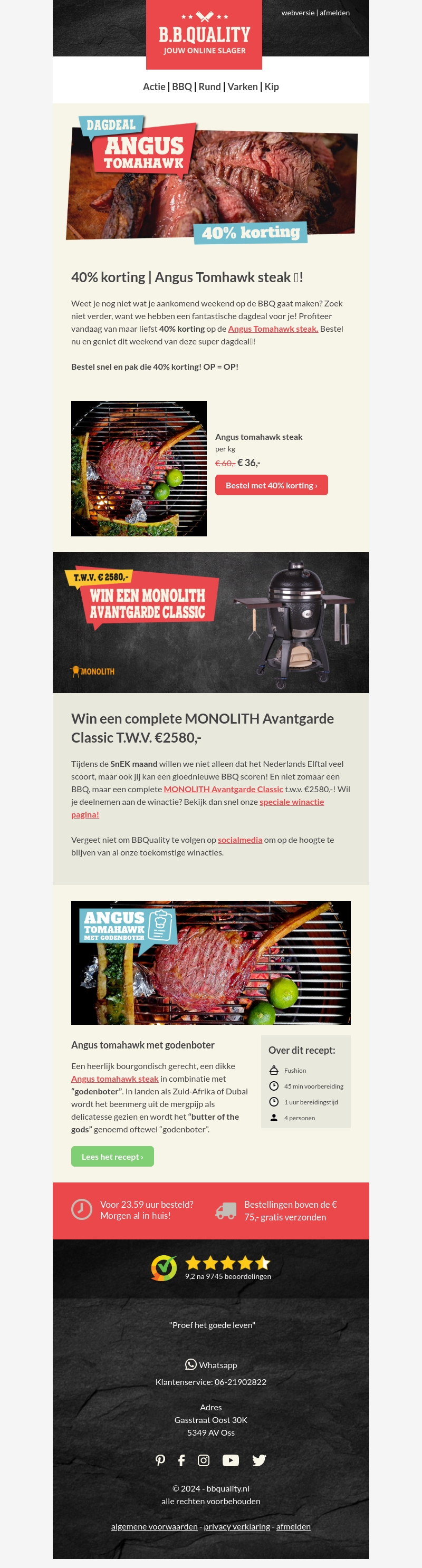 Ben je klaar voor een onweerstaanbare deal? Profiteer nu van 40% korting op de Angus Tomahawk Steak. Perfect voor je komende BBQ weekend! Bekijk ook onze extra winactie en recepten voor fantastische BBQ inspiratie!