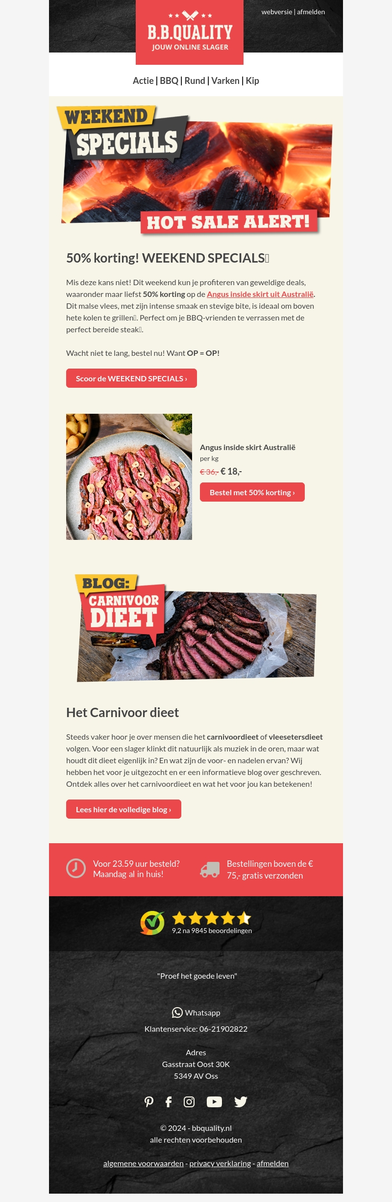 Mis deze kans niet! Dit weekend geniet je van geweldige deals, waaronder 50% korting op de Angus inside skirt uit Australië. Dit malse vlees is ideaal om boven hete kolen te grillen. Wacht niet te lang, OP = OP!